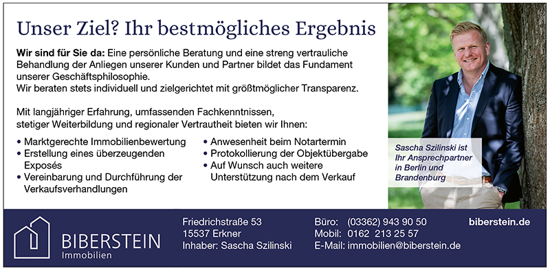 Telefon: (03362) 9 43 90 50, Mail: immobilien@biberstein.de, Web: www.biberstein.de